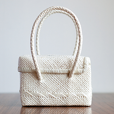 マーシャル諸島南東に位置するキリ島で、水爆実験後にビキニ環礁から移住した人々が作り始めた約60年の歴史あるバッグ。アミモノを通してマーシャル諸島と日本の交流を目指す。13cm×8cm×19cm(Sサイズ)、19000円。