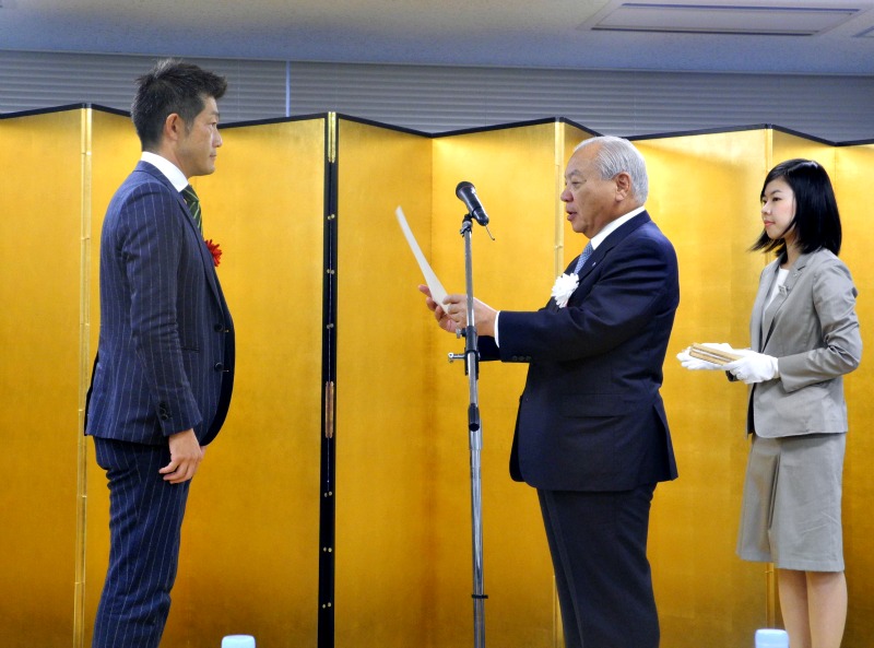 「eco検定アワード2015」の授賞式で。エコユニット部門大賞を受賞したセリタ建設芹田章博専務(左)