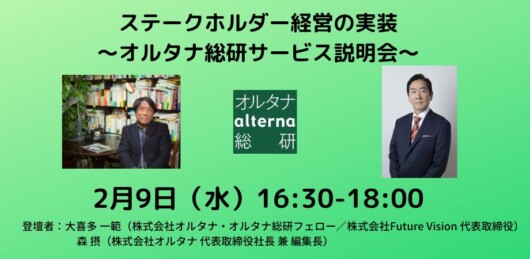今回のセミナーではサステナブル・ビジネス・マガジン「オルタナ」の編集長である森 摂と、YKK株式会社に30年間勤務したのち現在は株式会社FutureVision代表取締役の大喜多一範・オルタナ総研フェローが登壇します。