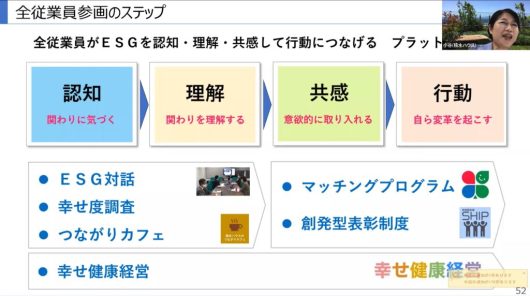 「全従業員参画」では全従業員がESGを認知・理解・共感して行動につなげることを目標とする。具体的には社員同士でコミュニケ―ションをとるESG対話や地域貢献の情報発信を行うつながりカフェ、幸せ度調査などに取り組む。