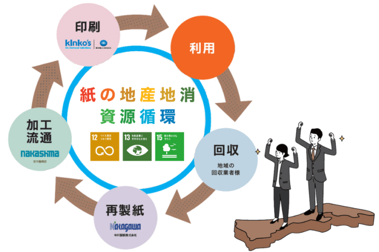 キンコーズ店舗を基点にして各エリアでの地域共創を図る。その一環で石川県での地産地消プロジェクト「おきあがみ」も生まれた。福祉施設や地域の子供たちと一緒に端材を活用したグッズをつくり、地域イベントへの参加、店舗で販売する例もある。東日本大震災をきっかけに、社会環境に恵まれない高校生・大学生の支援団体へ、印刷物の物品協賛を継続して行う。社内ではDEI取り組みの一環でe-ラーニング等を実施する。