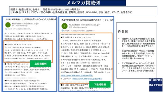 メルマガは毎週火曜日と金曜日に配信しています(登録者約9万人)。企業のサステナビリティ担当者だけでなく、省庁や自治体職員、大学教授、非営利組織の代表理事らにダイレクトで情報を届けることができます。イベントやセミナーの集客にも活用できます。