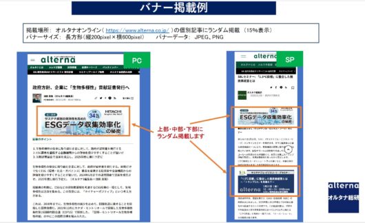 雑誌オルタナの純広告/記事広告やオルタナオンライン(月間100万PV)でのバナー(600ピクセル✕200ピクセル)広告掲載のほか、メルマガ3行広告(約9万通)、プレスリリースの作成支援、トップメッセージ収録、オウンドメディアの記事作成/運用支援などを特別価格でご提供します。
