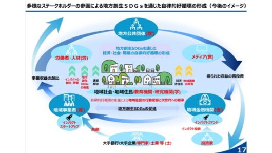 この理念は、内閣府が示したスライド資料にも明確に表れている。図版では、全国215のSDGs未来都市などの自治体がネットワークを形成し、各地域の「産官学金労言士」の各ステークホルダーが有機的につながり、学び合いながら連鎖的に広がる構図が示されている。地域資源を生かして課題解決と価値創造を両立させる「共創型の地方創生モデル」が描かれている。