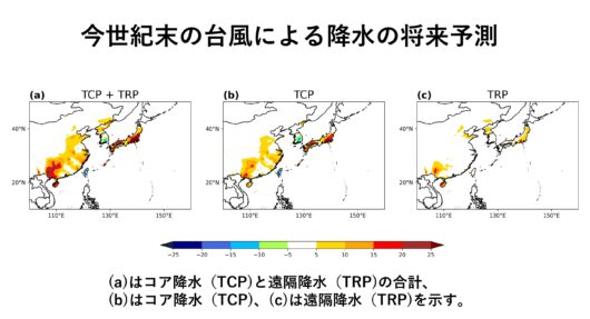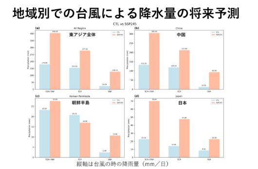 東アジアで発生した夏季の豪雨災害には、台風による極端降水に起因する事例がこれまでも多々あった。しかし、地球温暖化によって各地の台風降水がどのように増減するのか、具体的に地域別で示した将来予測はなかった。