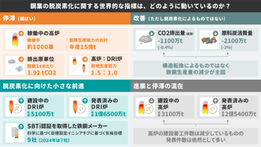 出典:停滞(稼働中の高炉、高炉とDRI炉の比率、排出原単位)、改善(CO2排出量、原料炭消費量)、小さな前進(SBTi認証、DRI生産能力、水素DRI生産能力)、進展と停滞の混在(建設中の高炉[2023年4月〜2024年4月]、発表済みの高炉[2024年9月時点])