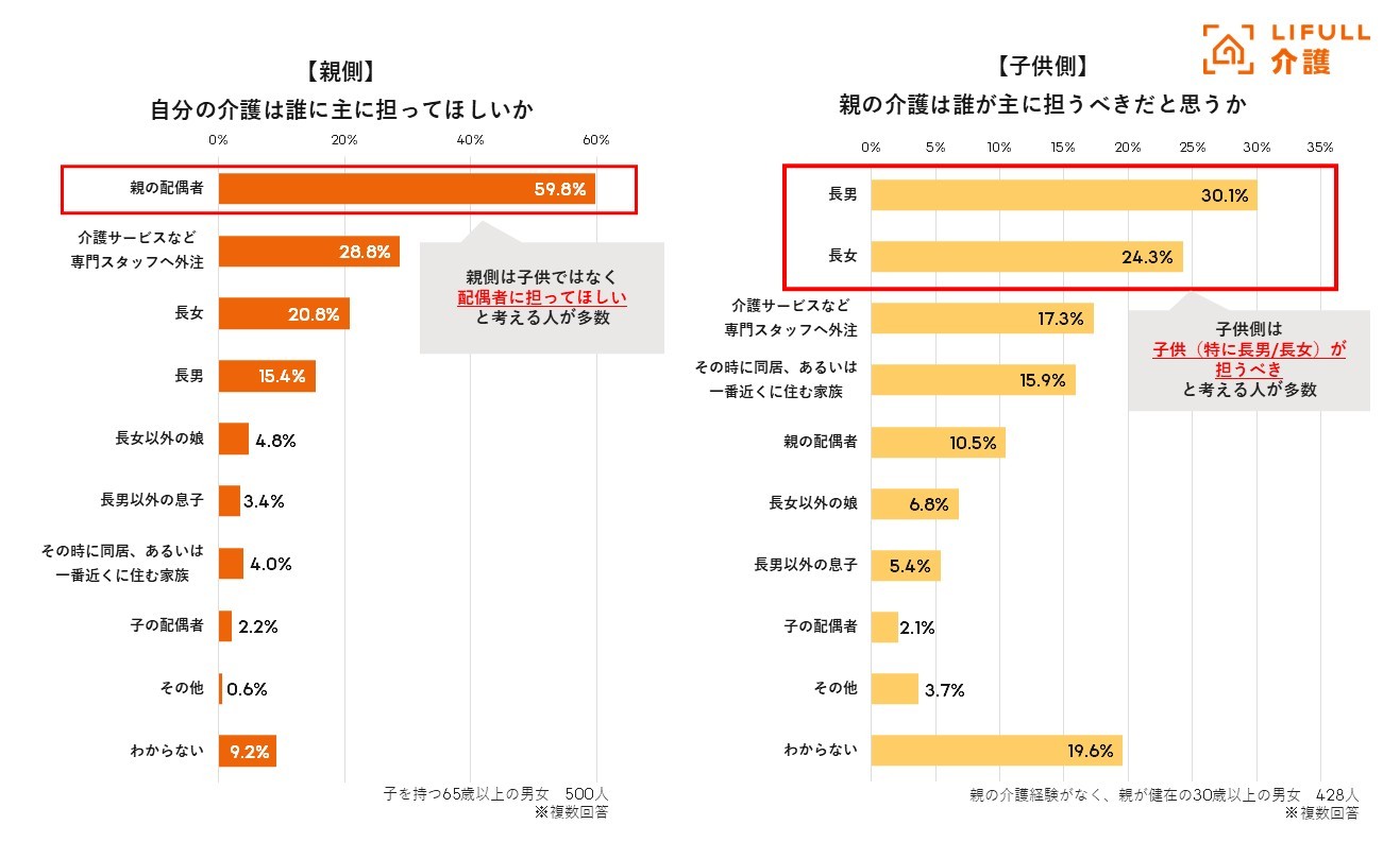 一方、子ども側は親の介護の主担当は「長男」(30.1%)と考える回答が最多で、 「長女」(24.3%)がそれに続いた。親が子どもへの負担を懸念する一方、子ども側は「介護は長男が担うもの」という意識が依然として根強いことがうかがえる。