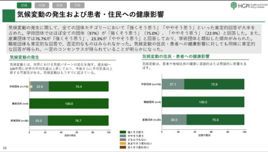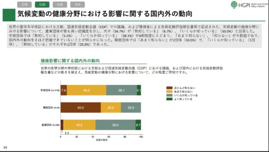 日本医療政策機構の菅原丈二副事務局長は、「国内の保健医療コミュニティが、気候変動と健康の問題の重要性を深く理解していることを示した。しかしその認識とは裏腹に、気候変動の適応策や緩和策の具体策に関する知識が不十分な団体が約6割に達し、問題意識と具体的な行動の間にギャップが存在することが明確になった」と話す。