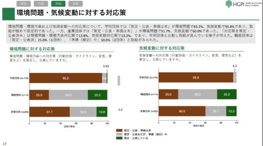 「環境問題や気候変動への対応策を策定・公表・準備している団体は極めて限定的(学術団体では90%以上が未策定・未準備)であり、特に学術団体においては、保健医療分野が温室効果ガス排出に寄与する度合いを過小評価する傾向も示唆されている」(菅原副事務局長)