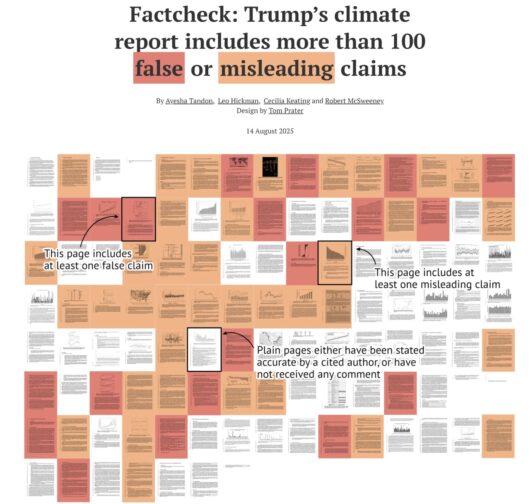図は、トランプ政権のDOE報告書の全ページを並べたもので、「間違い」(赤)や「誤解を招く」(オレンジ)箇所があるページに色を付けた。