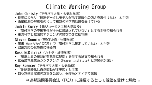 多くの科学者・専門家が関与する非営利団体「憂慮する科学者同盟(UCS)」(本部・米国)らは、「こんな諮問機関を秘密裏に作って報告書を書くのは、透明性の欠如でおかしい。連邦諮問委員会法に反する」として訴訟を起こした。そして訴訟を受け、クライメート・ワーキング・グループ自体は解散した。