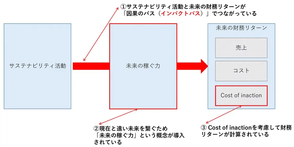 儲かるサステナビリティとは、トップラインの増加、コスト削減、そして「対応しなかった場合に発生するコスト(Cost of inaction)」の回避を通じて、短・中・長期のP/L改善に資するものであるという、「因果のパス(インパクトパス)」の考え方があります。