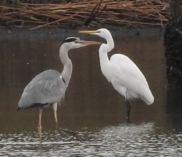 アオサギ(左)とダイサギ(右) 平均的にはアオサギがやや大きいとされるが、見た目はほぼ同じ大きさの印象。ダイサギは、アオサギに比べて個体差が大きい