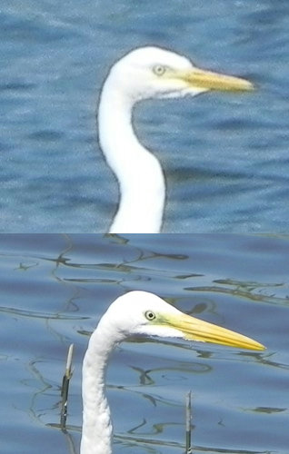 チュウサギ(上)とダイサギ(下)の頭部。ダイサギの頭部は、チュウサギに比べ細長く嘴はやや長い。眼の下に切れ長の「目じり」(口角の切れ込み)がある