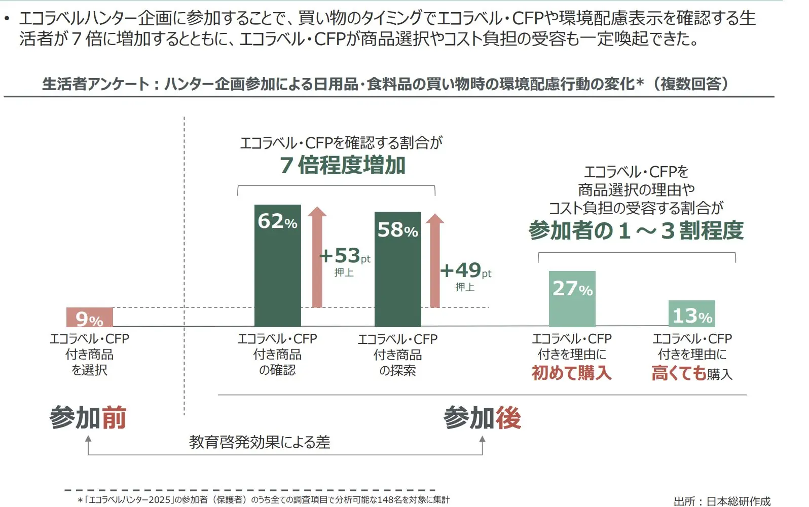 日本総合研究所(東京・品川)は1月22日、児童向け環境啓発が世帯の行動変容につながったことを示す実証成果を発表した。日本総研は、価格ではなく環境配慮を購買動機とした消費者行動の変容を検証するために、自治体、メーカー、小売と連携し、教育啓発から販促購買まで一気通貫での実証実験を試みた。エコラベル表示などを知る「学び」が、環境配慮への目利きを増やし、環境配慮商品の認知拡大や継続購買率の向上につながった。(オルタナ輪番編集長=北村佳代子)