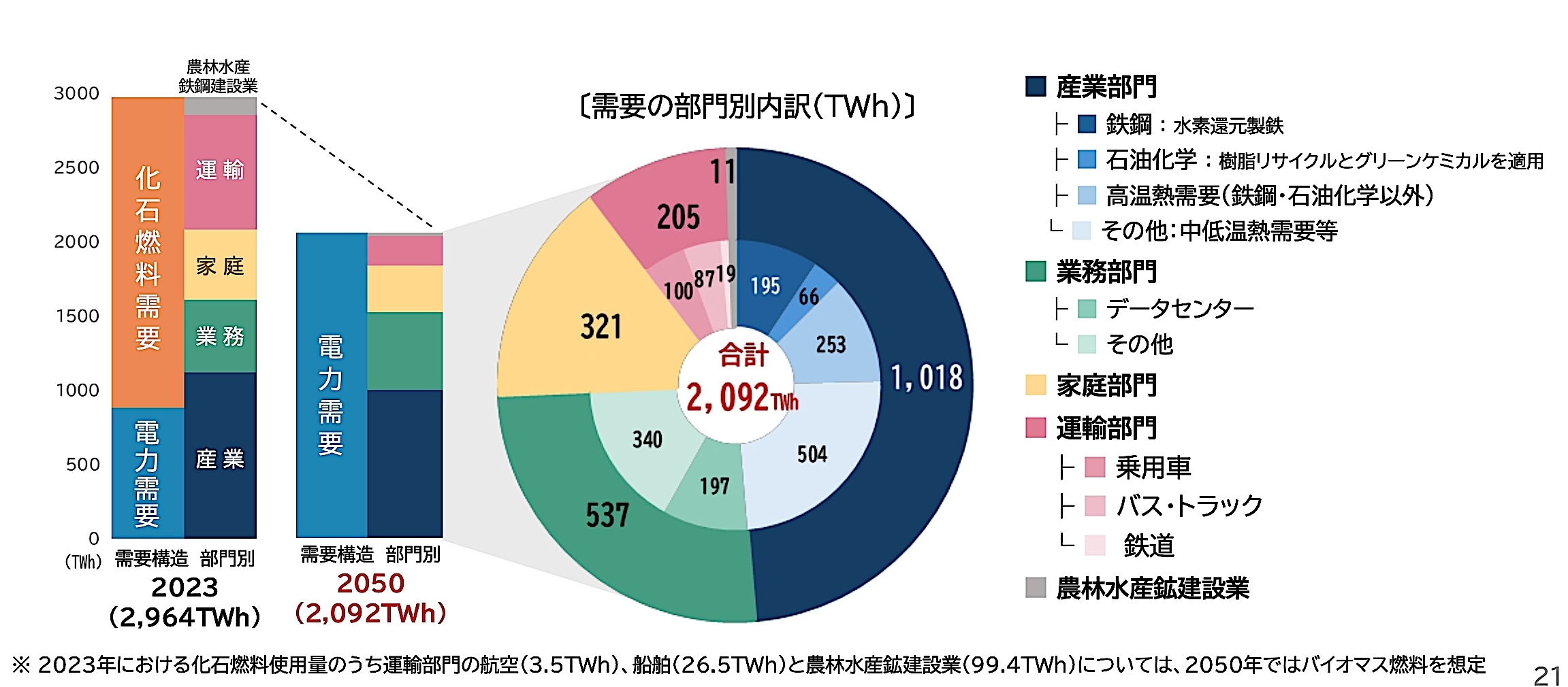 ビジョンでは、2050年の国内エネルギー需要を約2000テラワットアワー(TWh)と算出。これは電力だけでなく、石油やガスで賄われる「熱」(エンジンやボイラーなど)も含む。省エネの進展により総需要は現状(2023年:2964TWh)から約30%減る一方で、熱需要の電化によって電力需要は約2倍になる想定だ。