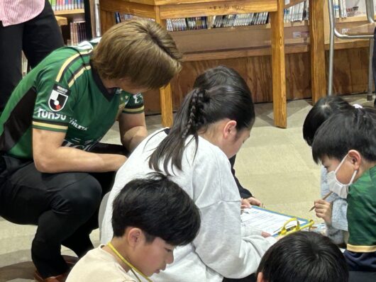 45分間の出張授業では、「FUTURE KID TAKARA」の予告編と第6話を視聴した後、選手から、温暖化でJリーグでも影響を受けていることや、熱中症リスクを判断する「暑さ指数」について共有した。