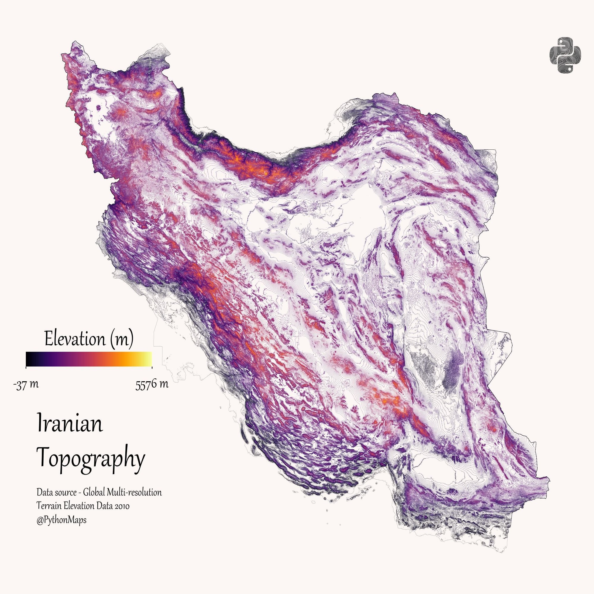 イランの地形。北西から南東に平行に走る無数の線は巨大なザグロス山脈