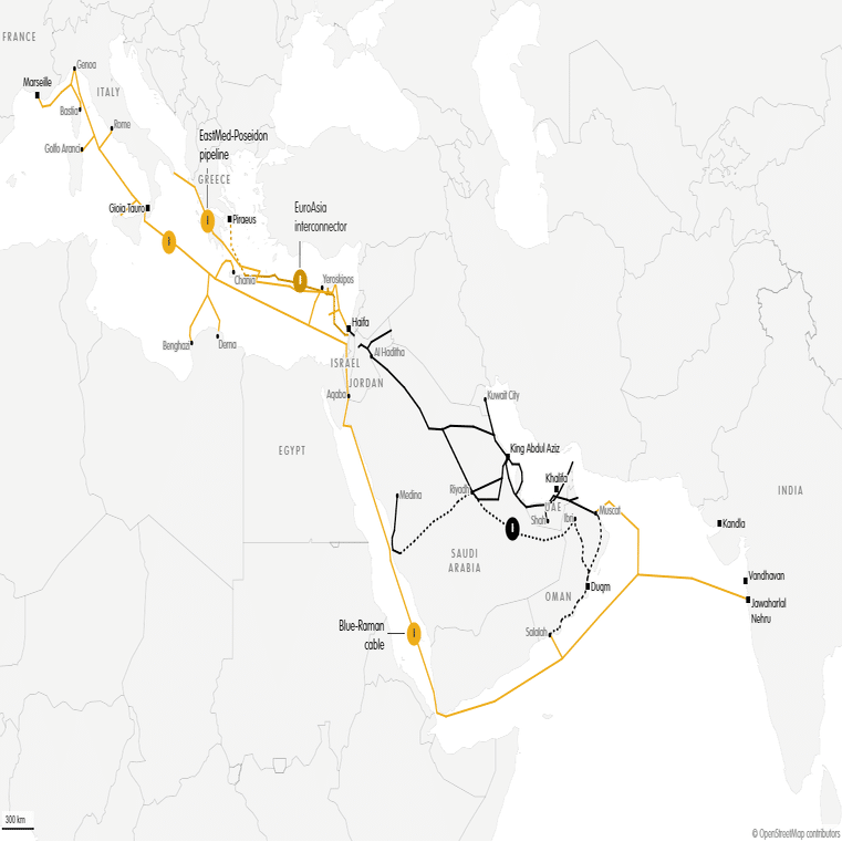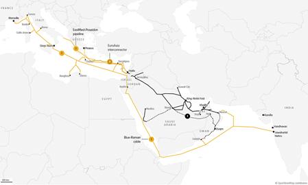 IMECのルートは、インド〜UAE〜サウジアラビア〜イスラエル〜欧州を結ぶものです。地図を見ると一目瞭然ですが綺麗にイランを避けています。