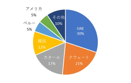 ではどこからナフサを輸入しているかというと、その多くはUAE、クウェート、カタールの中東諸国と、お隣の韓国だ。この4カ国で輸入量の8割を占める。