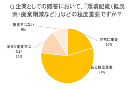 贈答品選びにおいて、贈り手の約8割が受け取る側の負担(管理・処分・スペース確保など)を「意識する」と回答した。環境配慮(低炭素・廃棄削減など)についても、約8割が「重要」としている。