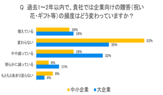 過去1~2年の贈答頻度では、中小企業の約5割が「変わらない」とする一方、大企業では4割超が「減っている」と回答した。