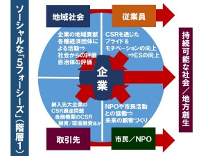 確かに、図1と図2はポーターの5forces に似ています。いわば「ソーシャルな5forces」とでも呼べるでしょうか。ここで付言すると、図2の領域(地域社会、従業員、取引先、市民/NPO)は当然のことながら大企業も無関係ではありません。いわば図1と図2は二階建てで、大企業は1階と2階は必須、中堅・中小企業は1階が必須ということになります。