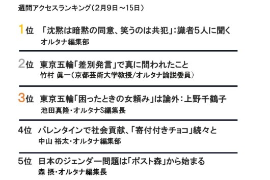1位:「沈黙は暗黙の同意、笑うのは共犯」:識者5人に聞く(オルタナ編集部) 2位:東京五輪「差別発言」で真に問われたこと(竹村 眞一・京都芸術大学教授/オルタナ論説委員) 3位:東京五輪「困ったときの女頼み」は論外:上野千鶴子(池田 真隆・オルタナS編集長) 4位:バレンタインで社会貢献、「寄付付きチョコ」続々と(中山 裕太・オルタナ編集部) 5位:日本のジェンダー問題改革は「ポスト森」から始まる(森 摂・オルタナ編集長) 6位:日本で最も「SDGsウォッシュ」なのは?(森 摂・オルタナ編集長) 7位:世界で年60億羽の雄ヒヨコ処分、生きたまま粉砕も(吉田 広子・オルタナ副編集長) 8位:調達する肉や卵、法令遵守できていますか?(岡田 千尋・認定NPO法人アニマルライツセンター代表理事) 9位:「再発防止の考えは」、支援団体が組織委に公開質問(池田 真隆・オルタナS編集長) 10位:ウォッシュだけではない:企業の「SDGs症候群」(森 摂・オルタナ編集長) 前週のアクセスランキングはこちら その他のおすすめ記事はこちら