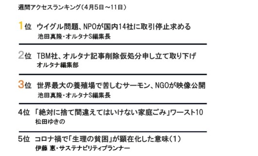 オルタナオンラインの週間記事ランキング(4月5~11日)です。