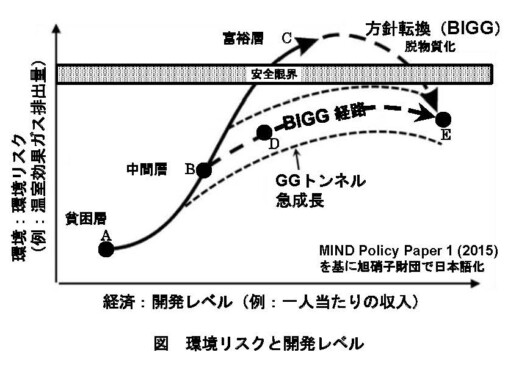 BIGGは、各国それぞれの開発段階に合わせて、異なる持続可能な開発の道筋を示しています。既に安全限界を超えている先進国は、生活の質を維持しつつも変革を進め、経済と環境の両立を目指します。途上国は、先進国の通った道ではなく、最新の技術や知見を活かして、安全限界を超えることなくグリーン成長トンネルを通って経済と環境の両立を目指します。