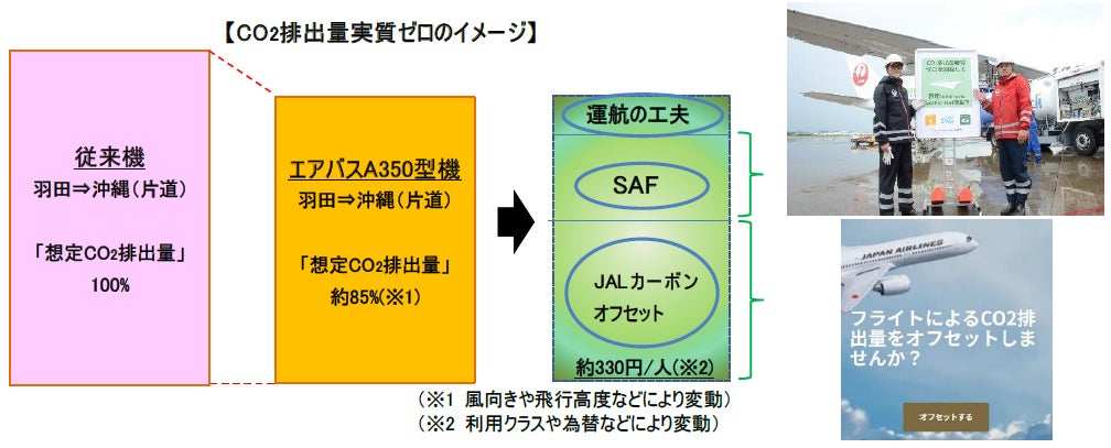 本チャーターフライトでは、従来機と比較してCO2排出量を15%~25%程度削減できるエアバスA350型機を使用。運航の工夫、持続可能な代替航空燃料SAF(Sustainable Aviation Fuel)の搭載と、JALカーボンオフセット(*2)を活用し、CO2排出量実質ゼロのフライトを実現します。