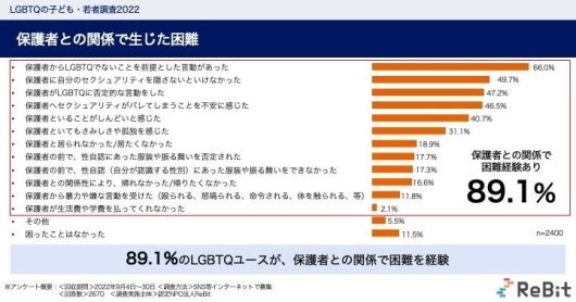 LGBTQユースの89.1%が保護者との関係で困難を経験したと回答した。具体的な困難状況は、「保護者からLGBTQでないことを前提とした言動があった」(66.0%)、「保護者に自分のセクシュアリティーを隠さないといけなかった」(49.7%)、「保護者がLGBTQに否定的な言動をした」(47.2%)、「保護者へセクシュアリティがバレてしまうことを不安に感じた」(46.5%)だった。