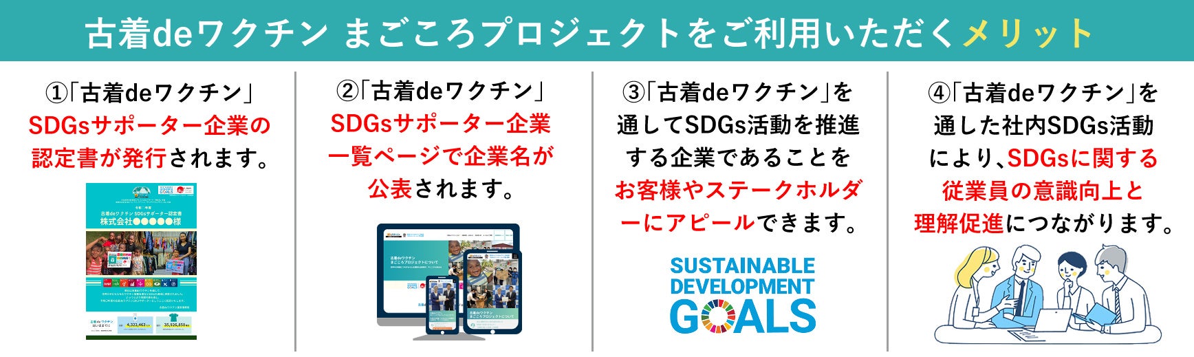 近年ではSDGs機運の高まりから、個人の方だけでなく企業のCSR・SDGs活動の一環として古着deワクチンをご利用いただくケースが増えております。そこで、2022年10月1日より企業の皆様のSDGs活動を支援する目的で、企業・団体様向けプラン「古着deワクチン まごころプロジェクト」の提供を開始いたしました。