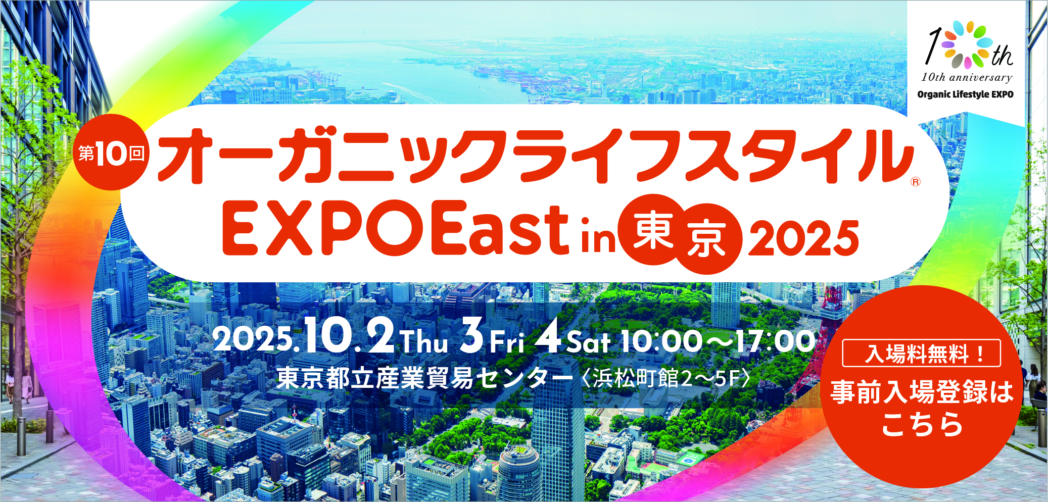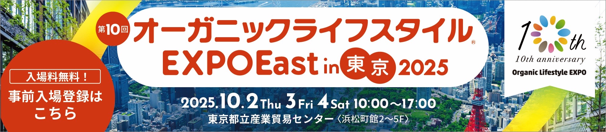 | 同時開催 | 第10回 オーガニックライフスタイルEXPO EAST in 東京2025(10周年記念大会)、各種ワークショップ、セミナー、サステナブル★セレクション2025三つ星選考会/ユース賞発表・表彰式/二つ星・三つ星発表・表彰式 他 |